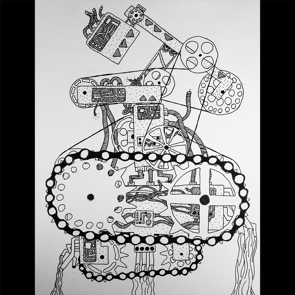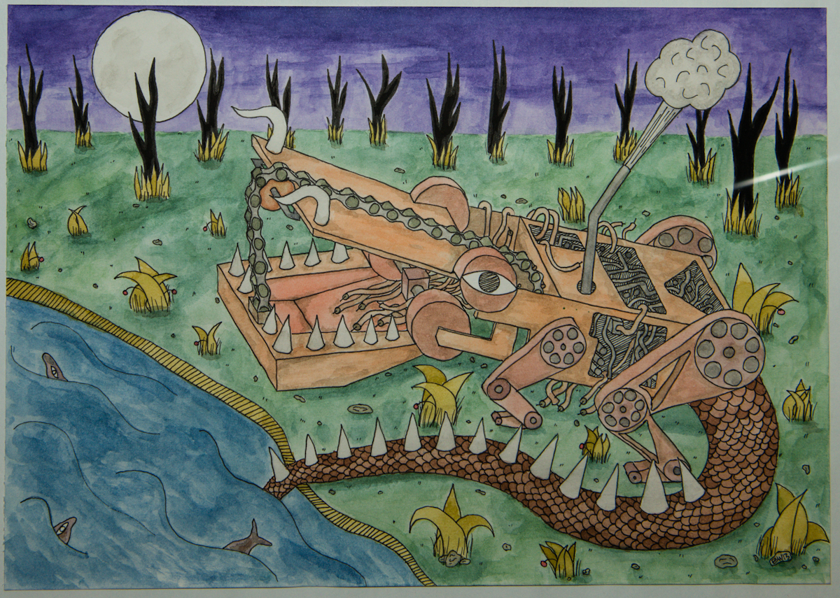Senaste akvarellen blev klar i dag. Själva idén hade sitt ursprung i kedjan som öppnar och stänger underkäken, sedan sprang timmarna iväg och det blev en slags mekanisk reptil.
