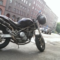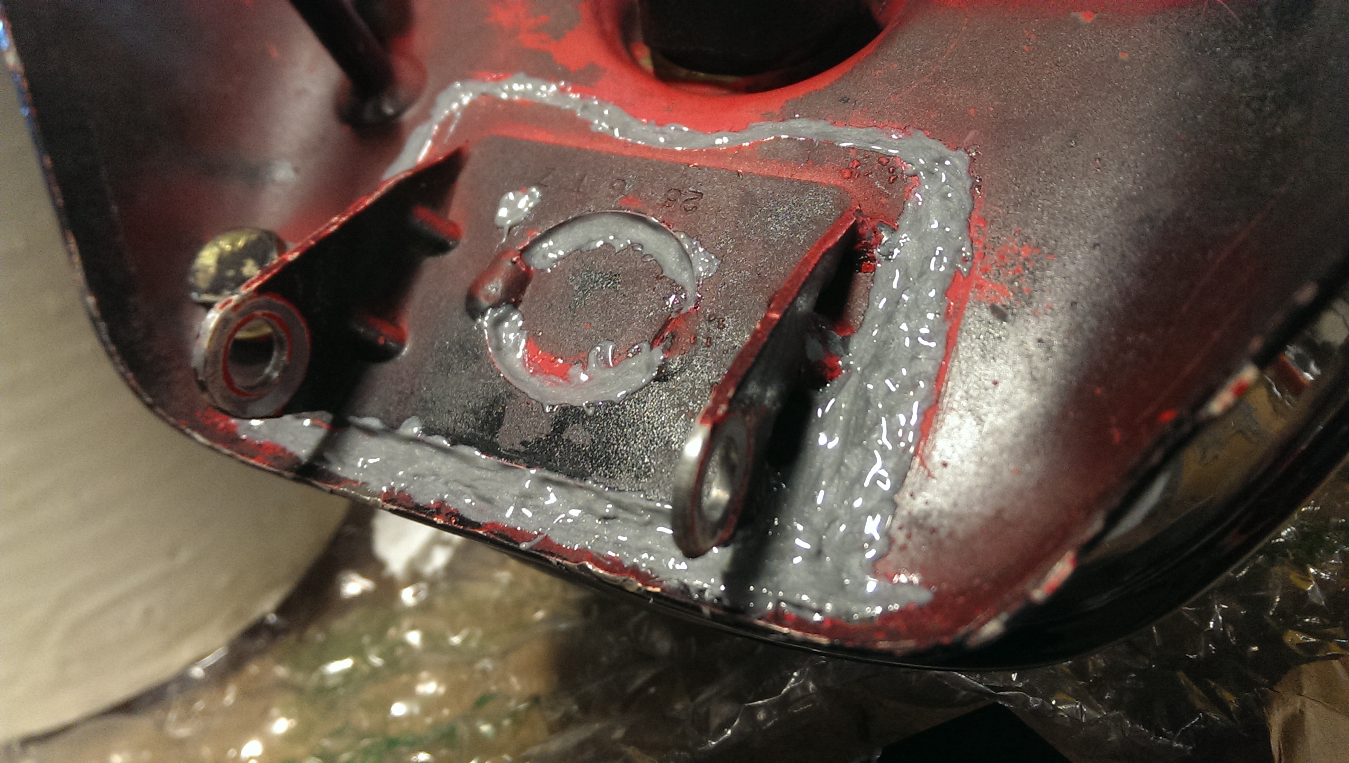 När man tror att allt löst sig, efter att verkstaden löst alla de tidigare felen, uppstår såklart nya. Tanken började läcka lite smått när den stod parkerad på en gata, detta eskalerade sedan under kvällen och man kunde hitta en bensinpöl under hojen på morgonen därpå i garaget. Jag skaffade metallepoxy och plockade ner tanken för att täta lagningen samt lite omriktning i ramen. Efter det höll den tätt, skönt.